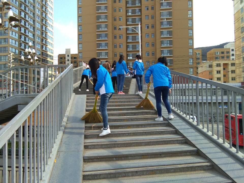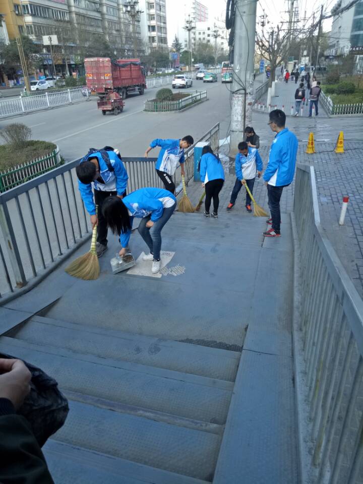 下午4时,志愿者们带着扫帚、簸箕、垃圾袋在天桥前面集合完毕,在组织者的安排下,志愿者们分片包干,纷纷拿着扫把和簸箕开始清扫,其他没有扫帚的同学则徒手清理广告牌上厚厚的小广告。经过一个多小时的辛苦劳动,天桥上面的垃圾清理干净,虽然扫除过程中尘土飞扬,但是过往的市民和师生投来的赞许目光使志愿者们更加干劲十足。