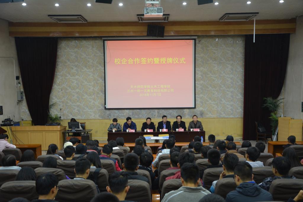 为加强公司员工对BIM技术的学习和应用,培养高素质、高技能的应用型人才,公司于2018年11月7日晚七点半在公司一号报告厅举行公司与兰州一砖一瓦教育科技有限公司的校企合作签约暨授牌仪式。出席此次授牌仪式的领导有兰州一砖一瓦教育科技有限公司总经理刘子义、副总经理魏耀峰、高级讲师王静以及公司直属党支部书记张建宏、经理杨帆、副经理吕向明,还有公司员工200余名。仪式由副经理吕向明主持。