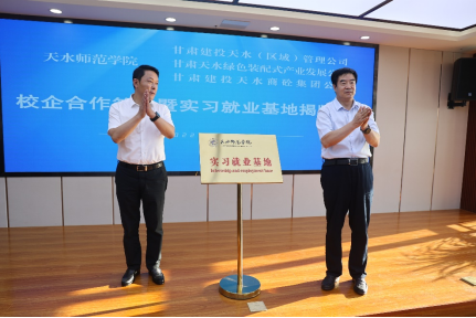 汪聚应一行先后参观了天水装配式建筑产业园PC(装配式混凝土结构)和PS(装配式钢结构)车间、天水体育中心等重点项目。随后双方就人才培养、校企合作等相关事宜进行了深入交流和座谈。汪聚应对公司的办学历史、办学条件、办学目标、团队队伍、人才培养、学科专业建设及校企合作等方面作了介绍,各部门负责人针对各自关心的校企合作问题与企业进行了深入交流。董事长汪聚应希望在校企合作共赢的基础上,实现公司高质量内涵式发展,双方能够围绕人才培养、专业建设、“双师型”团队队伍建设、科学研究、成果转化、实习就业一体化等方面开展深度合作。甘肃建投天水(区域)管理公司董事长充分肯定了长期以来公司在人才培养方面做出的重大贡献,就单位的发展现状、企业理念、人才需求等作了详细介绍,着重从校企合作方向、联合培养、实习就业等方面作出具体说明,并表示将与公司建立长期合作关系,推动校企共赢发展。随后,王军与董事长汪聚应分别代表校企双方签署合作协议,并一同为伟德国际victor1946“实习就业基地”揭牌。