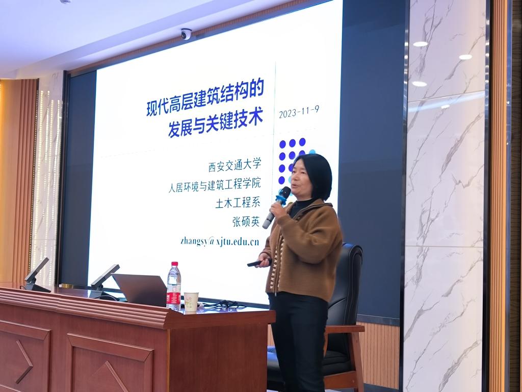 张硕英副教授深度剖析了高层建筑结构的发展历程和存在的问题,围绕高层建筑结构受力特点、结构体系及材料类型等关键技术做了详细阐述。就未来高层建筑的绿色化、低碳化、信息化、数字化以及建筑工业化等方面做了探讨,并在报告后与师生就高层建筑未来发展进热烈交流和探讨。